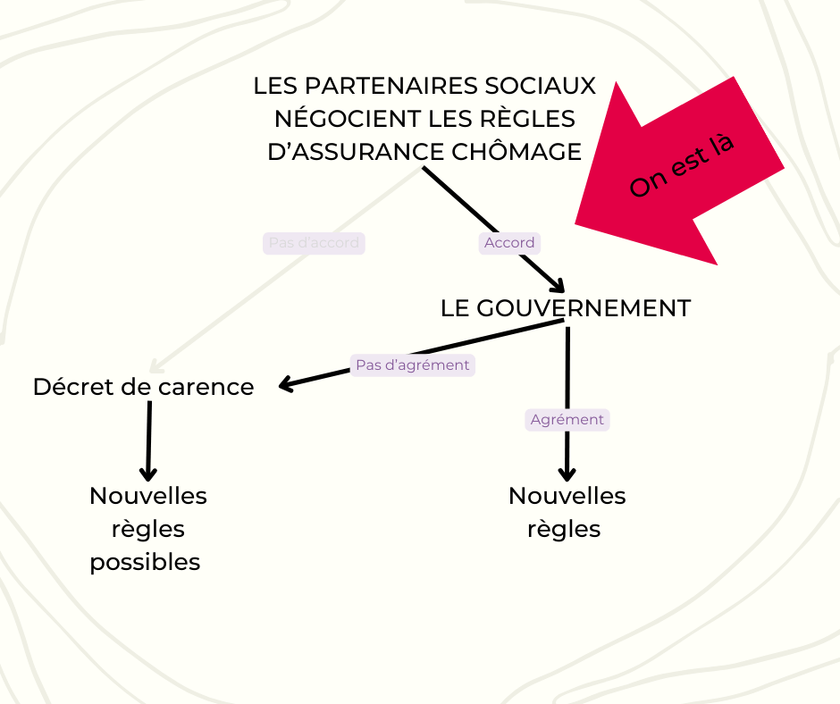 Prochaines Ă©tapes : l’accord est ouvert Ă signature jusqu’au 17/11/2023. RĂ©daction dĂ©taillĂ©e de la convention d’assurance chĂŽmage et des textes juridiques. PrĂ©sentation Ă la PremiĂšre Ministre pour agrĂ©ment. Validation ou refus ?